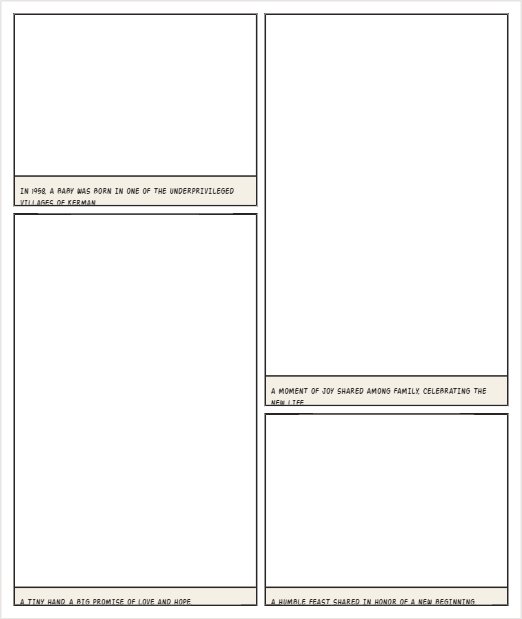 Frame 1 – Birth and Childhood Scene: A newborn baby named Qasem is born in a simple rural house in one of the underprivileged villages of Kerman, Iran. Environment: Mud-brick house, family gathered around, morning sunlight streaming through the windows, plains and nature visible outside. Mood: Simple living, poverty, but full of family love. Dialogue / Speech Bubble: Mother: “Welcome, little Qasem!” Narration: “In 1958, a baby was born in one of the underprivileged villages of Kerman.” Fram
