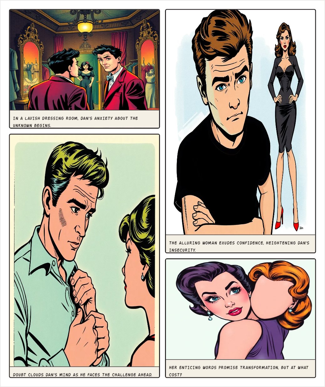 Dan (short black spiky hair, brown eyes), an introverted 26 year old insecure about his height (159 cm) is forcibly feminized. She makes him try on various outfits, a variety of very detailed high heels, and teaches him to behave in a feminine manner. The story begins with Dan being shaky in front of this mysterious woman who is dressed in a very sexy yet elegant outfit with 6 inch high heels, she is taller than D