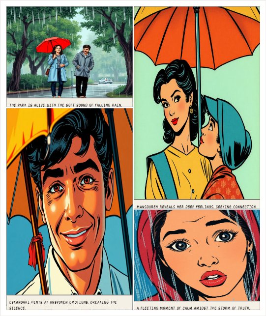 Page 4 – Emotional Moment with Mansoureh Visual: Mansoureh and Eskandari under a shared umbrella in a park, light rain falling softly. Dialogue: Mansoureh: “You’ve been like a brother to us…” Eskandari (soft smile): “Maybe… like a love too.” Caption: “A fleeting moment of calm amidst the storm of truth.”