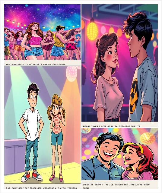 5️⃣ Disco lights Prompt: Camp disco, colorful lights, teenagers dancing Text: Masha (thought): “Okay… now or never.” 6️⃣ First approach Prompt: Girl approaching boy at disco, shy smile Text: Friend: “How much do your sneakers cost?” Ilya: “Seriously? That’s the first question?” 7️⃣ Laughing together Prompt: Both laughing, relaxed vibe Text: Ilya: “You’re funny.” Masha: “You don’t look boring ei