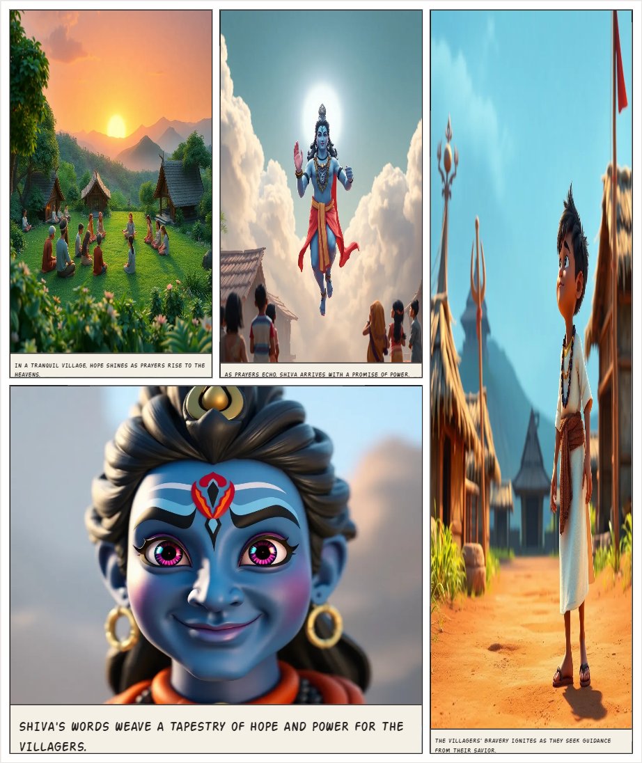 shiva giving 5 elements to 5 villagers while villagers are praying to win against villans