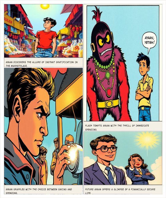 Make a comic of nearly 25 - 30 pages, based on this ๐ COMIC STORYLINE Topic: Saving vs Spending (Financial Literacy) Title โโน1000 Today or โน10,000 Tomorrow" ๐ค Characters Ayaan โ a student (main character) Flash โ the Impulse Monster ๐น (villain) Future Ayaan โ guide from the future โณ Piggy Bank โ silent helper ๐ท (option)