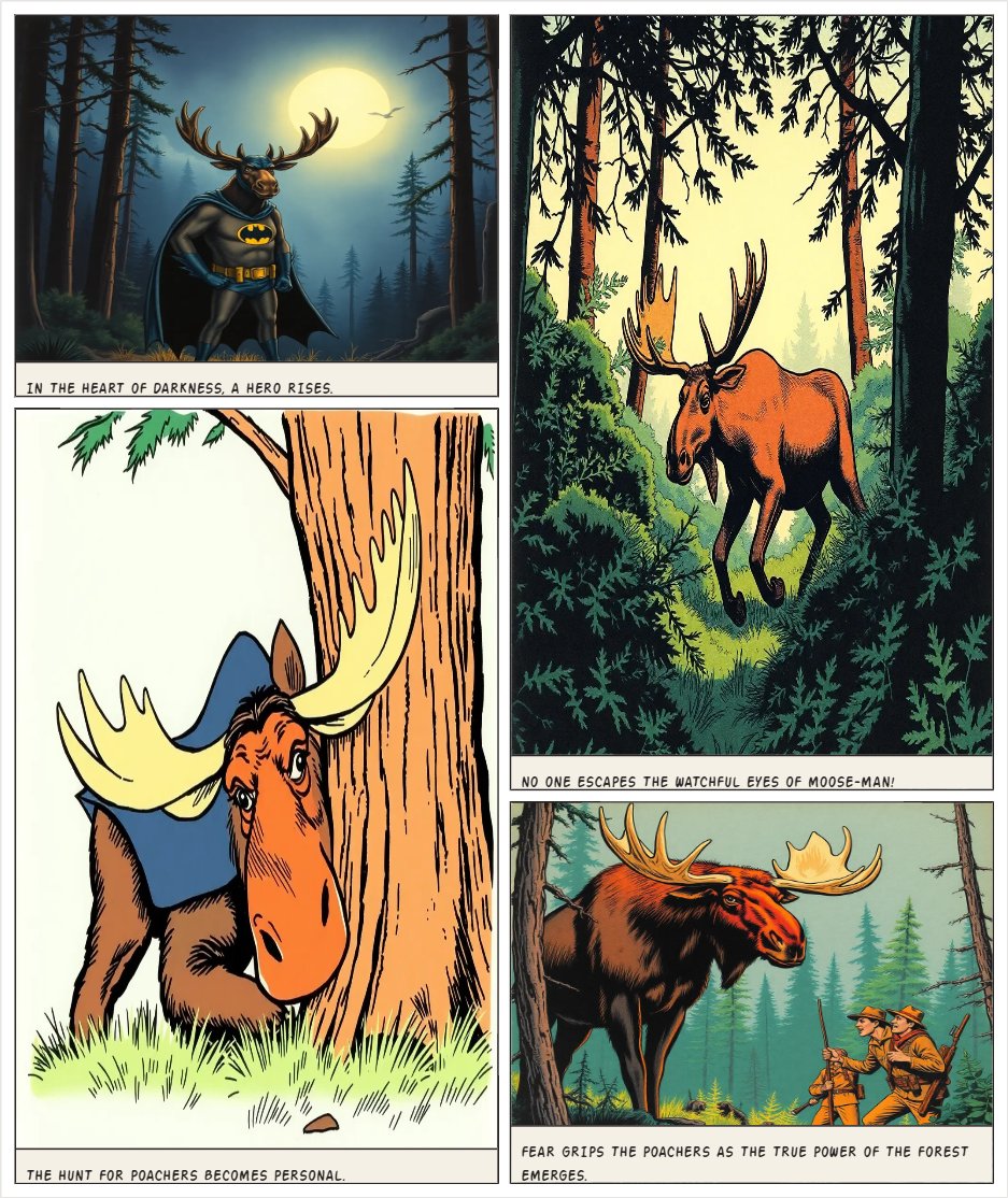 a moose dressed as batman fighting crime against poachers in the dark worrds