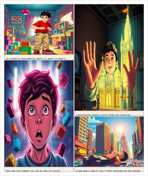 Vitor, de 12 anos,cabelo preto e olhos castanhos, usa camisa vermelha, calça cargo bege e tênis vermelhos enquanto brinca em seu quarto cheio de peças de LEGO. Uma construção começa a brilhar e, ao tocá-la, o quarto treme, as peças voam e ele se transforma em um boneco de LEGO. Quando tudo se acalma, Vitor abre os olhos diante de uma enorme cidade feita de blocos lego.