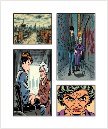 A young man with long hair pushing a wheelchair with an old angry woman up a derelict city street in the near future. The woman shouts "PUSH ME FASTER!"