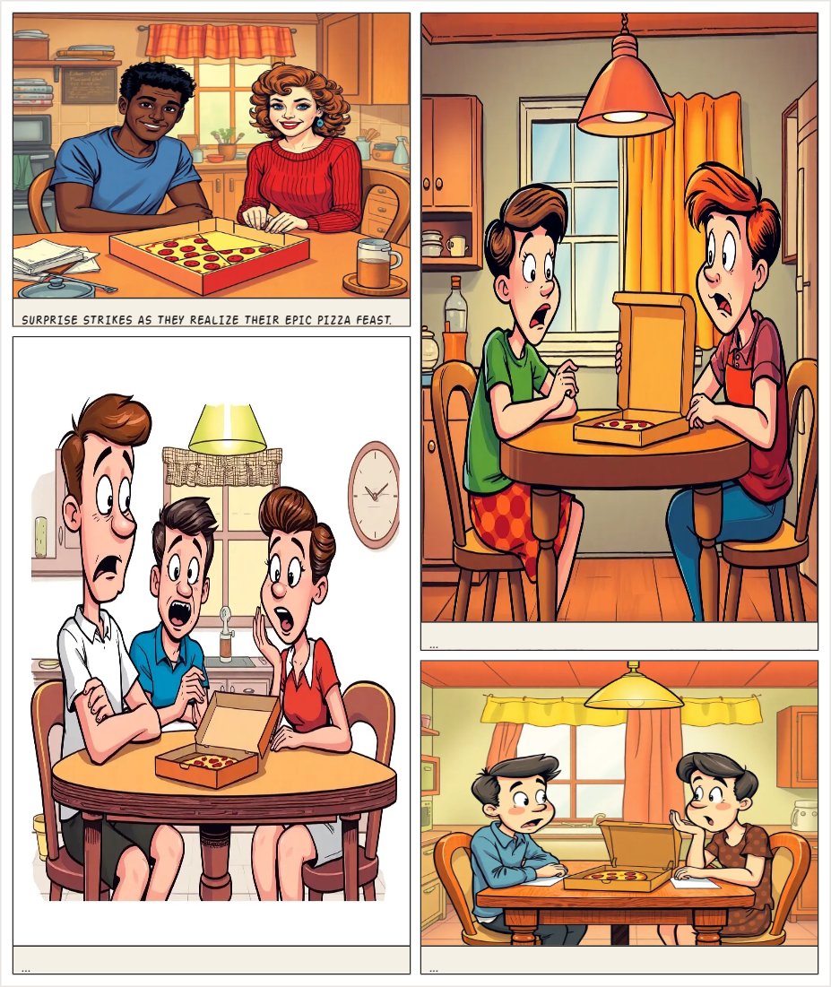 Create a single-panel sitcom-style comic. Two friends are sitting at a kitchen table. There is an open pizza box. Both characters look surprised. Warm lighting, expressive cartoon style.
