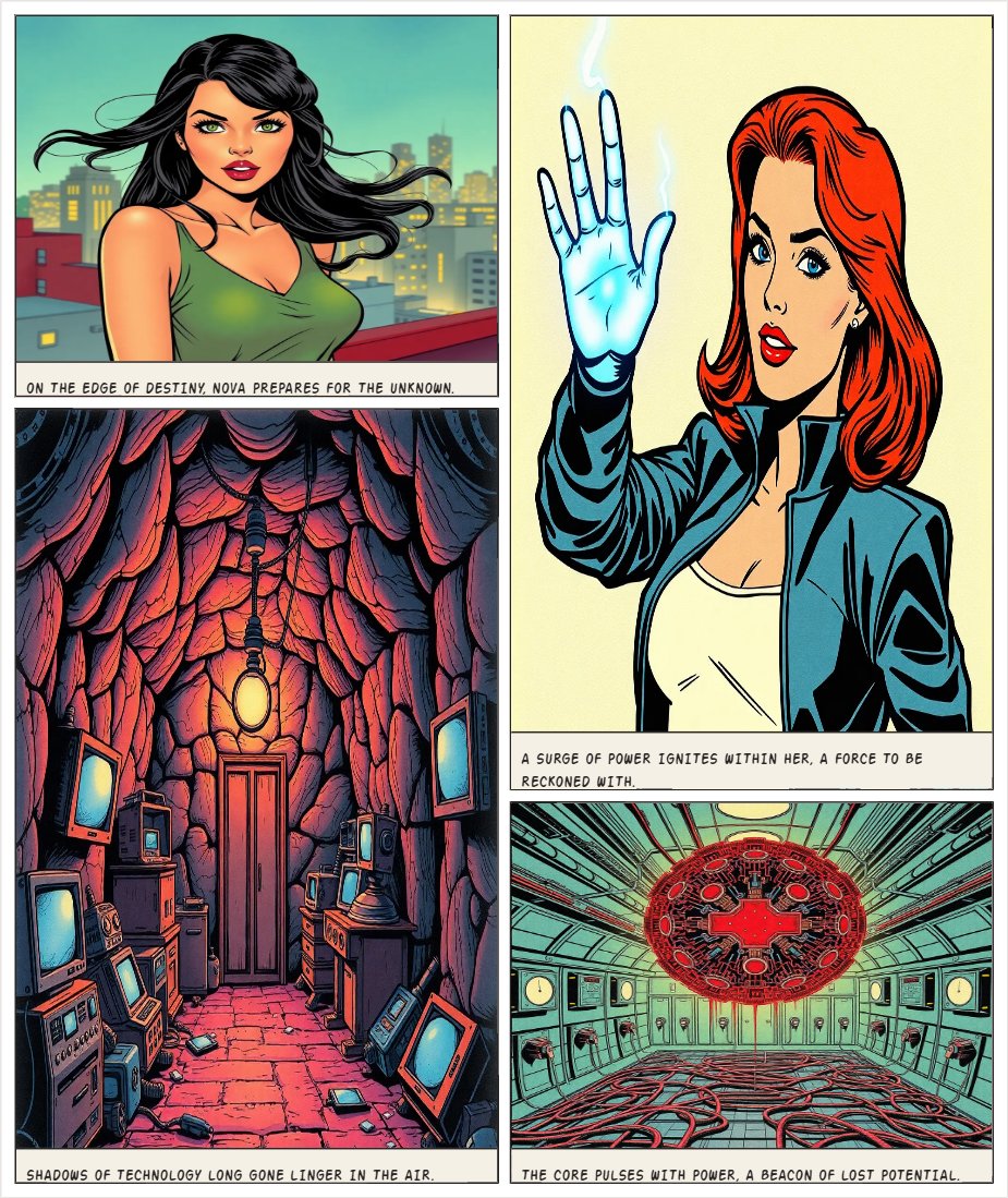 Close-up of Nova standing on a rooftop, wind blowing her hair, city lights reflected in her eyes. Nova’s hand glowing with a small blue light, mysterious energy forming. Underground laboratory, broken screens, old robots lying on the floor. A giant AI core floating in the center, glowing red, cables everywhere.