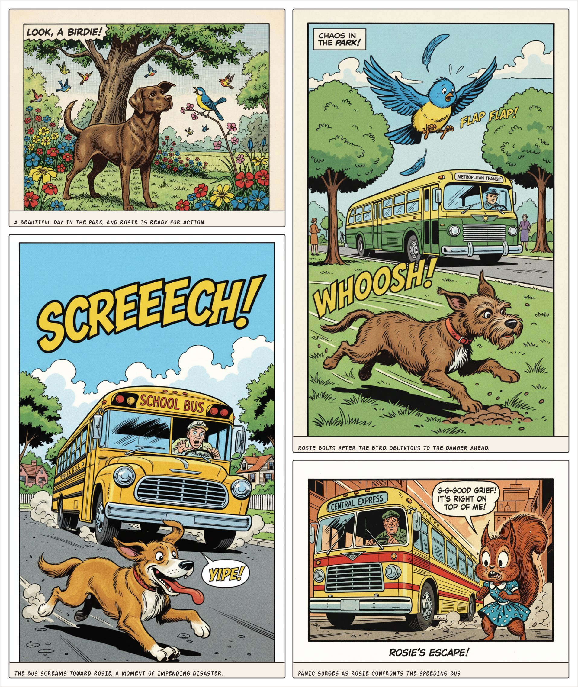 Rosie the dog that is a brown chocolate lab takes off chasing a bird and runs in front of a bus