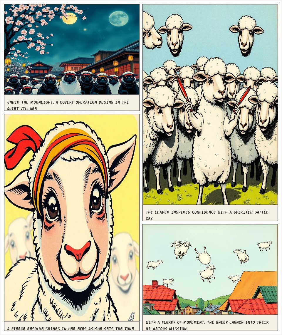 Créer une bande dessinée humoristique et dynamique mettant en scène des moutons ninjas. Les moutons sont mignons mais redoutables, portant des tenues de ninja noires avec des bandeaux colorés. L’histoire se déroule dans un village japonais traditionnel, de nuit, éclairé par des lanternes. Les moutons utilisent des techniques ninja exagérées (sauts acrobatiques, shurikens en laine, fumée cartoon). Style graphique : bande dessinée / manga, traits nets, expressions très expressives, couleurs vives.