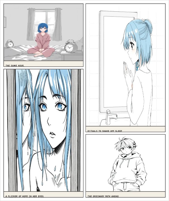 An alarm clock rings. Caption: “The same hour.” The blue hair girl sits on her bed. Morning light enters through the window. She washes her face in front of the mirror. Her reflection is clear. She walks down the street. The surroundings feel ordinary.