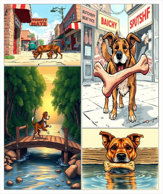 Ek baar ki baat hai, ek kutta tha jise bahut zor se bhook lagi thi. Wo khane ki talash mein idhar-udhar bhatak raha tha. Achanak, use ek butcher (kasai) ki dukaan ke paas ek haddi (bone) mili. Kutta bahut khush hua aur usne socha ki wo ise akele sukoon se baithkar khayega. Haddi ko munh mein dabaye hue, wo ek nadi ke upar bane chote se pul se guzar raha tha. Jaise hi usne niche nadi ke pani mein dekha, use apni hi parchhayi (reflection) dikhayi di.