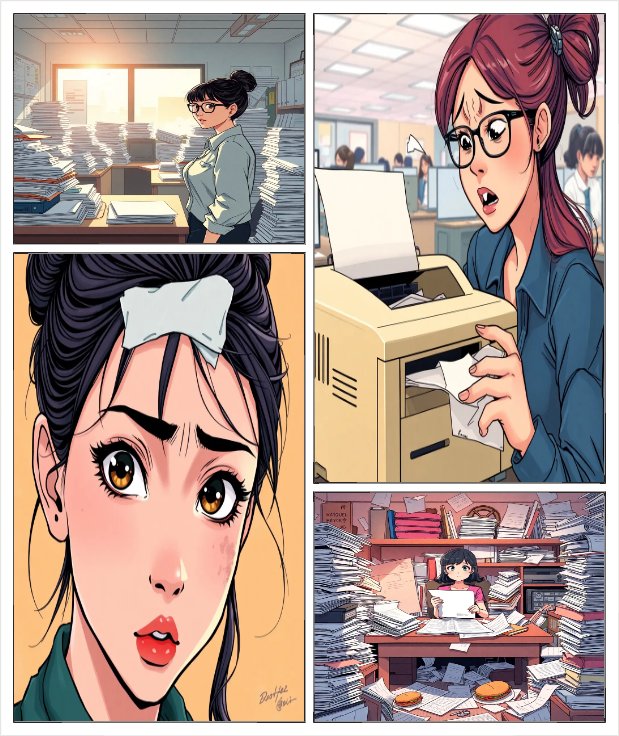 Una funcionaria llamada raquel con gafas,pelo negro recogido en un topo, en la oficina de trafico a la cual le pasa de todo de manera muy comica,la impresara se atasca,o le lanza centenares de copias,se le olvida la contraseña,intenta organizar todo y acaba con un verdadero desastre de papeles esparcidos por la mesa,organiza un caos en todo momento de manera comica,haciendo que cada dia sea una aventura comica en la oficina.