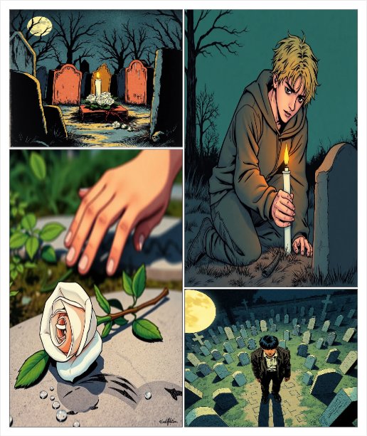 Назва: “Поки горить свічка” Жанр: драма, романтика, трагедія Атмосфера: тиха, холодна, болюча Сюжет: Кожної ночі, коли місяць піднімається над старим кладовищем, Акіра приходить до однієї й тієї ж могили. Він — блондин із втомленими очима, у яких давно не було сну. Перед ним — свічка і білі троянди. Тут спочиває Міо — його подруга. Дівчина, яку він любив… але так і не встиг сказати цього вголос. Колись вони сміялися разом, ділилися мріями, обіцяли “завжди бути поруч”. Міо казала, що боїться темр