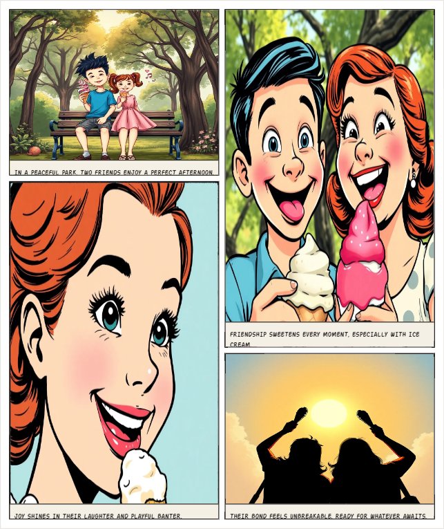 TAVOLA MANGA – stile shōnen, bianco e nero, retini, contorni marcati, alto contrasto. SCENA: Mattia e Beatrice pirati amici seduti insieme su una panchina, sorridenti, ognuno con un gelato artigianale in mano (cono grande, palline colorate). Atmosfera rilassata, sole che filtra tra le nuvole, linee morbide. EFFETTI: piccoli cuoricini e note musicali attorno ai personaggi. STILE GLOBALE: manga shōne