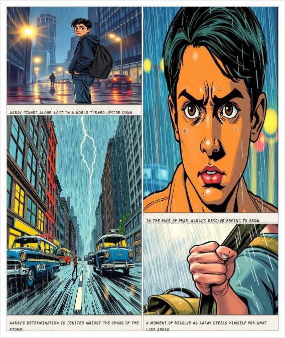## **Title: *From Ashes to Iron*** ### **Protagonist:** Aarav Malik **Age at start:** 14 **Setting:** A crowded city where glass towers loom over aging apartment blocks --- ## **CHAPTER 1: THE SILENCE AFTER** **Opening splash panel:** A rainy street at night. Police lights blur into the puddles. Aarav stands frozen, a school backpack hanging from one