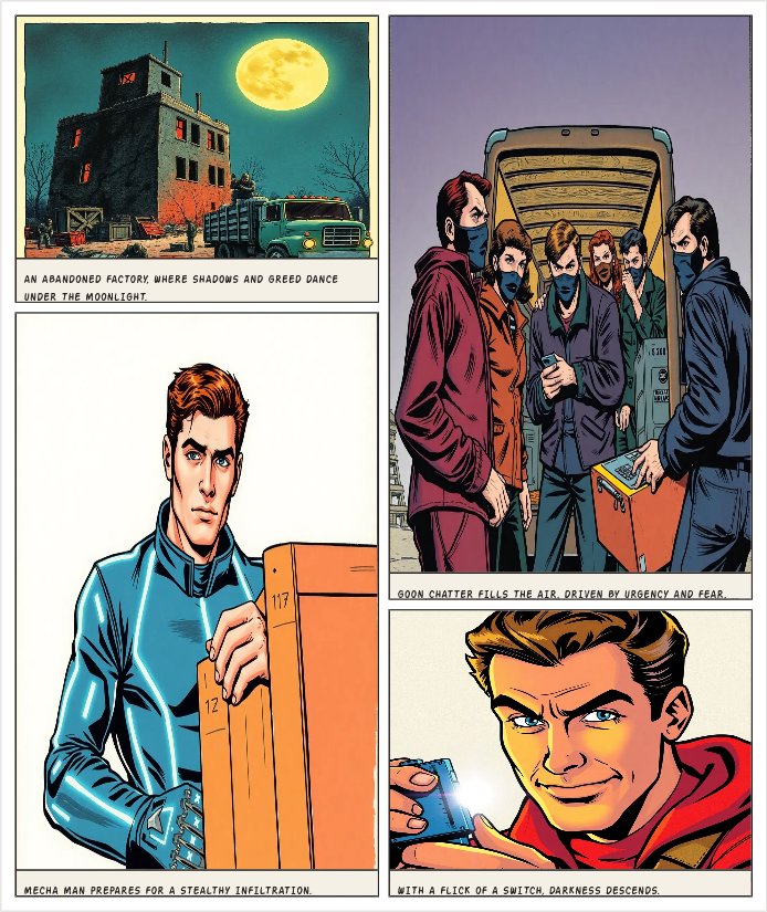comic for dispatch (game by adhoc studio) characters invisigal and mechaman Revised Story Outline: “Mecha Man: Silent Retrieval” Page 1 – Factory Establishment / Tension Old, abandoned Red Ring facility at night. Goons are looting old Red Ring tech after Shroud’s defeat. Newspapers or old TVs hint at the recent events. Crates, laser guns, and assorted tech scattered around, some goons loading trucks or grabbing equipment. Page 2 – Mecha Man Hacking / Lights Out Robert observes through a