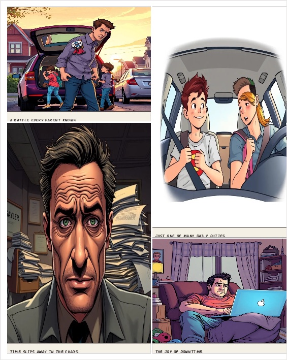 a man working all day, taking kids to school, office, cleaning, putting kids to bed. finally has enough time to himself. Last panel is he is just watching family guy clips on his computer.