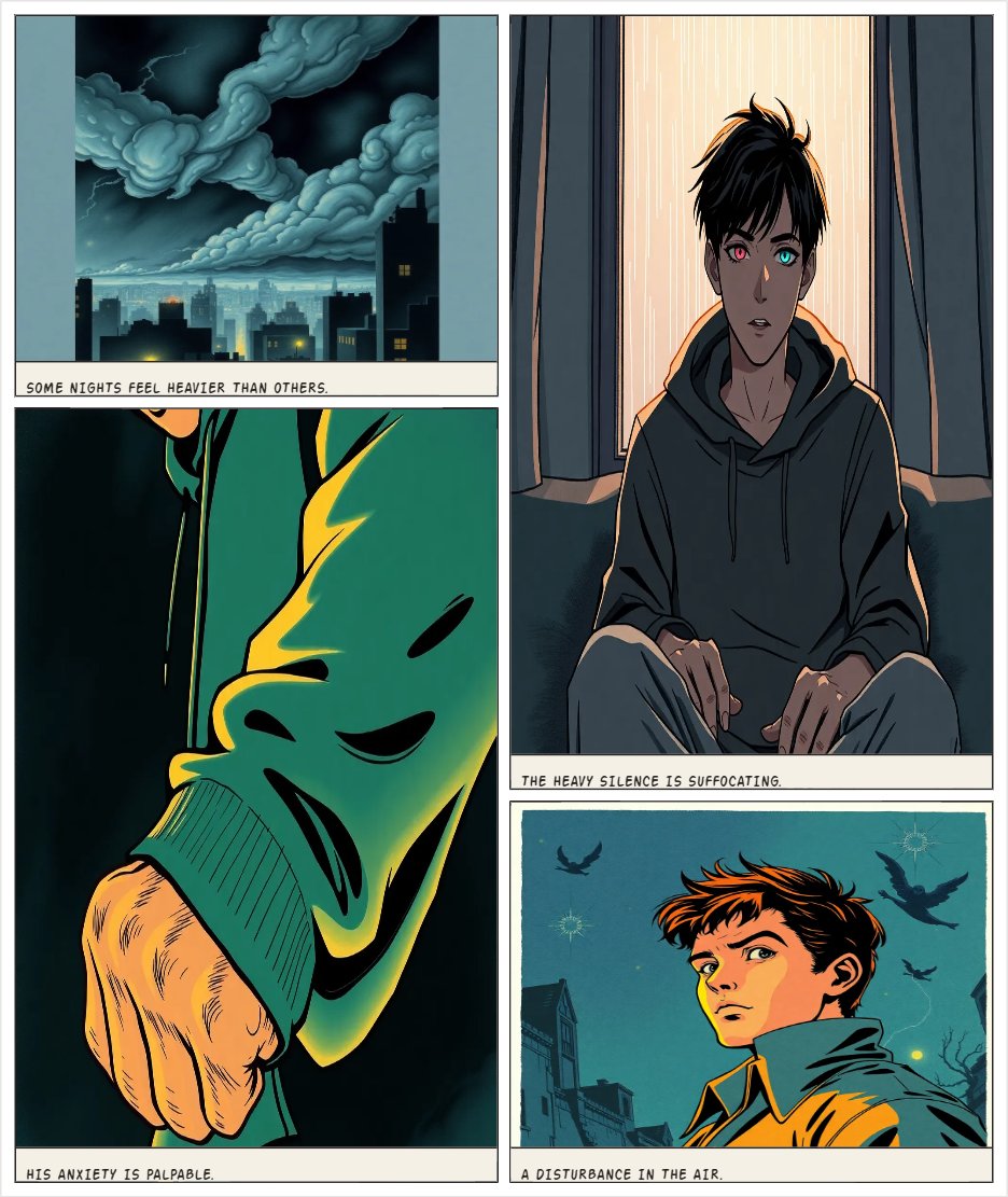 COMIC ADAPTATION THE RIFT BETWEEN WORLDS CHAPTER 1 — THE BROKEN REALM (Comic Version) PAGE 1 Panel 1 (Wide splash) A stormy city skyline at night. Thunderclouds rolling in. Caption: Some nights feel heavier than others. Panel 2 Interior. Ken sits alone in a dim room, rain streaking the window. Close on his mismatched eyes (pink / cyan). Panel 3 (Silent) Ken’s hoodie sleeve clenched in his fist. PAGE 2 Panel 1 Close-up: the air behind Ken ripples slightly. Panel 2 Ken turns, eyes narrowing