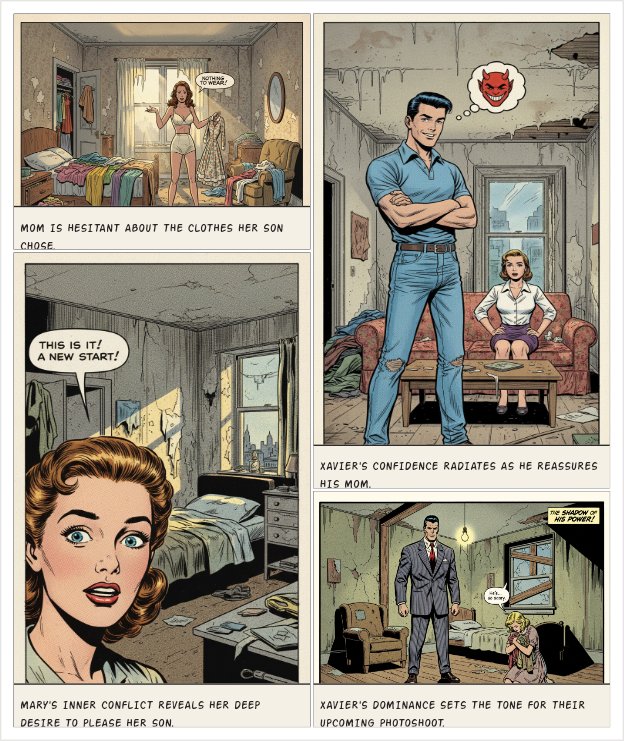 A 40 year old submissive masochistic mom , Mary, turned porn star for her adult son, Xavier. Mary is has long brown hair, huge breasts and butt. Right now she is looking at clothes her son picked out in her underwear. Xavier is tall slim build, wearing a blue polo shirt and jeans. The mom is very submissive and nuturing to her son. Xavier is very domaint. They are getting ready to take some profile pictures for their porn website.