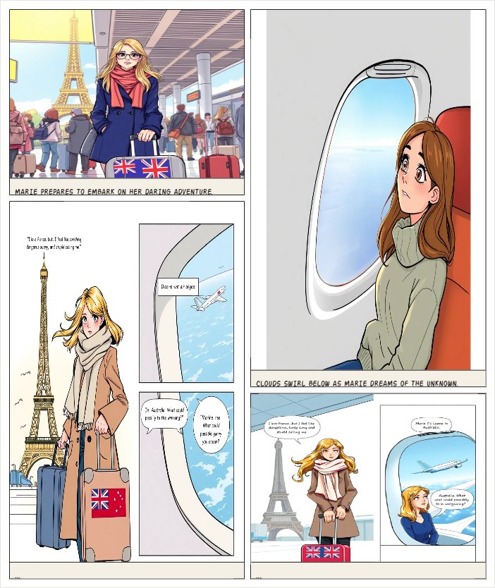 PAGE 1 – FROM FRANCE TO THE UNKNOWN Panel 1 Description: Marie standing at a French airport. Blonde hair flowing, scarf, stylish coat. Eiffel Tower in the background. She holds a suitcase with an Australian flag sticker. Dialogue (Marie): “I love France… but I feel like something dangerous, sunny, and stupid is calling me.” Panel 2 Description: Inside an airplane. Marie by the window, eyes wide, plane flying over the ocean. Dialogue (Marie): “Australia. What could possibly go wrong?” Panel