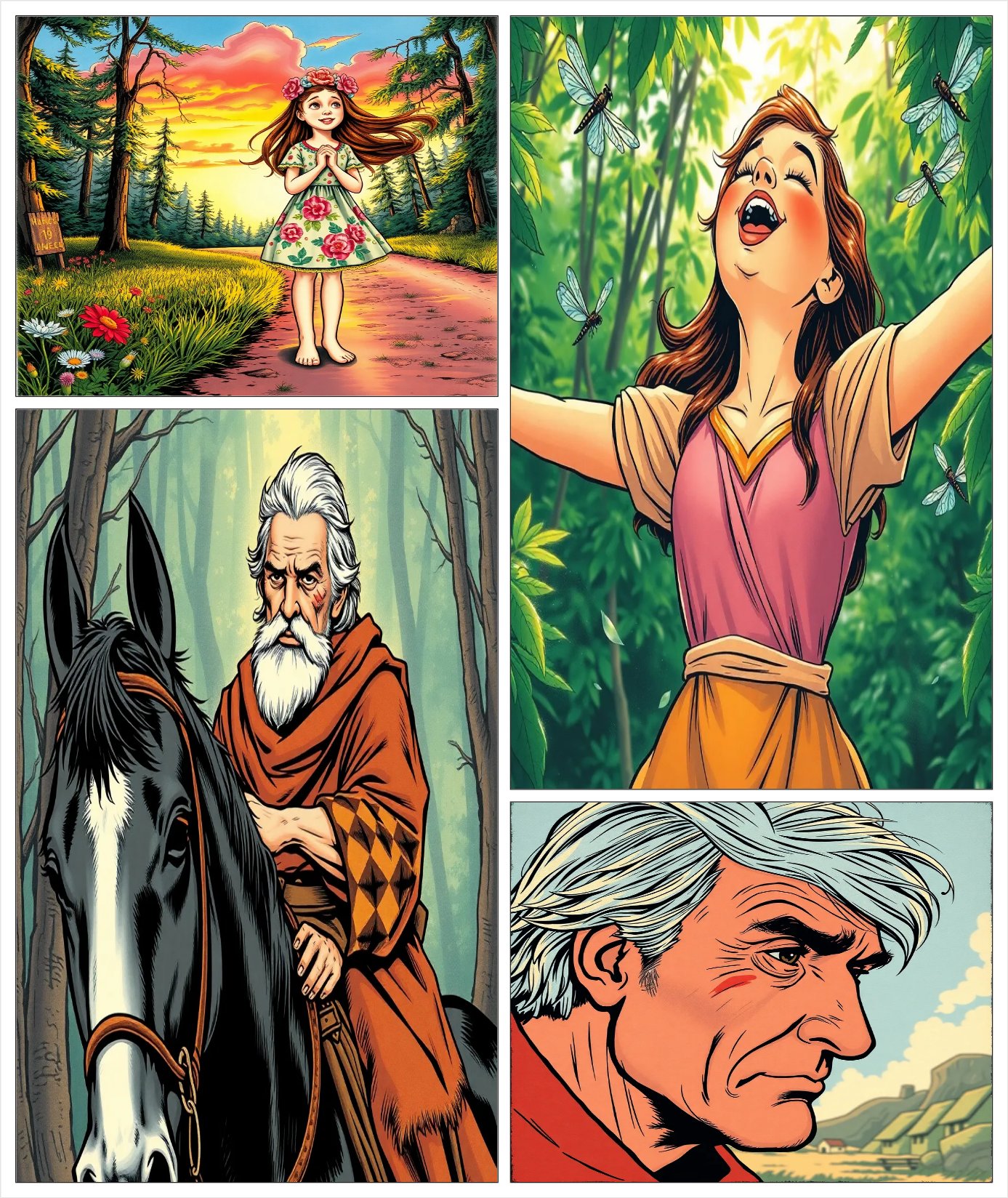 Динамичная панель: Барболка в венке из гвоздик стоит босиком у обочины, поет, ветер треплет косу; седой Пал на вороном жеребце с шрамом на щеке смотрит вдаль слепыми глазами, витязи подмигивают; лесные буки и стрекозы в фоне.
