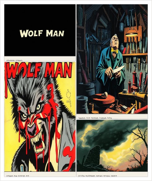 FADE IN Page 1 Panel 1: Black screen. A white English inscription slowly appears: WOLF MAN Panel 2: A sharp metallic noise is heard, like a knife being sharpened. Panel 3: The letters turn red, as if soaked in blood. Panel 4: Darkness “swallows” the title. FADE OUT → FADE IN