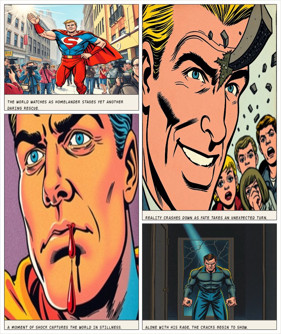 During a staged rescue, Homelander is struck by falling debris. It cuts his cheek. A single drop of blood falls. The world freezes. Phones capture it. Social media explodes. Vought panics. Homelander laughs it off—but later, alone, he punches a mirror… and his hand shatters bones instead of glass. He screams.