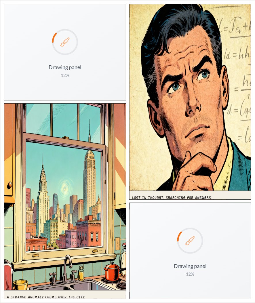 morning in a cozy kitchen, Oscar in civilian clothes at a table with coffee and laptop, papers with physics formulas around him, soft daylight. Panel 2: close-up of his thoughtful face looking at formulas. Panel 3: view through the window showing the city, tiny strange light distortion hinting at future anomalies in the distance. Panel 4: a simple panel with Oscar sitting at the table, space in the center of the panel left mostly empty and bright, ideal to add a handwritten dedication later.
